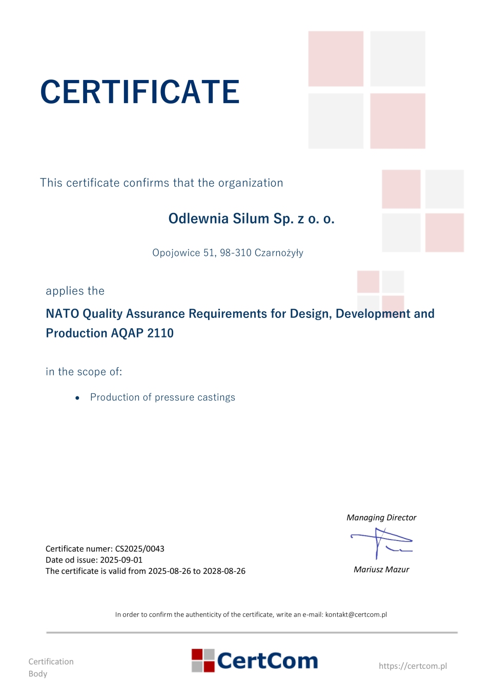 Certyfikat AQAP 2110 - Odlewnia SILUM