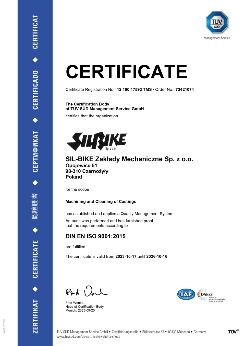 Certyfikat ISO 9001 - Zakłady Mechaniczne SIL-BIKE