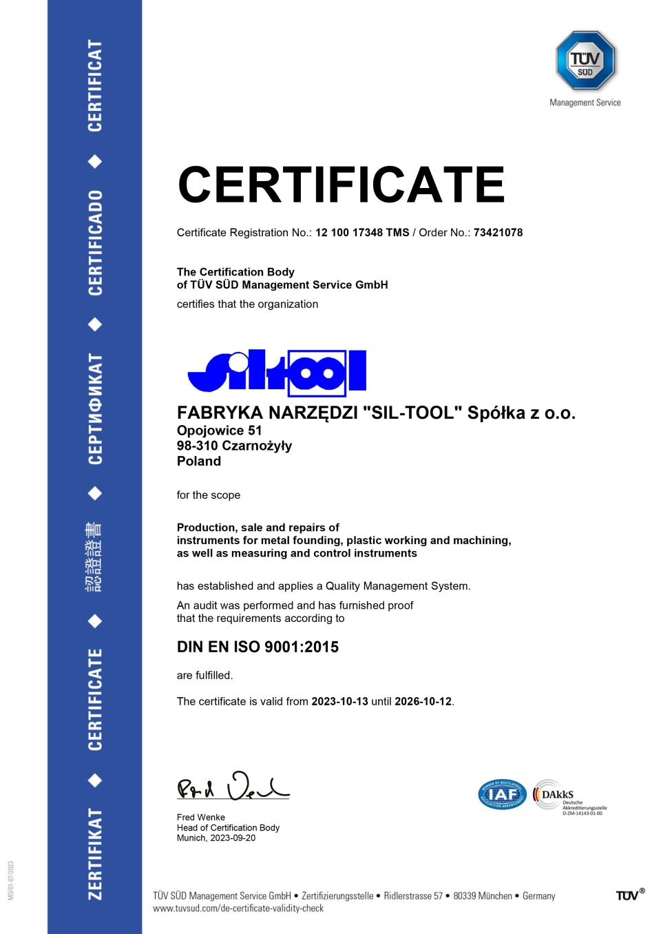 Certyfikat ISO 9001 - Fabryka Narzędzi SIL-TOOL